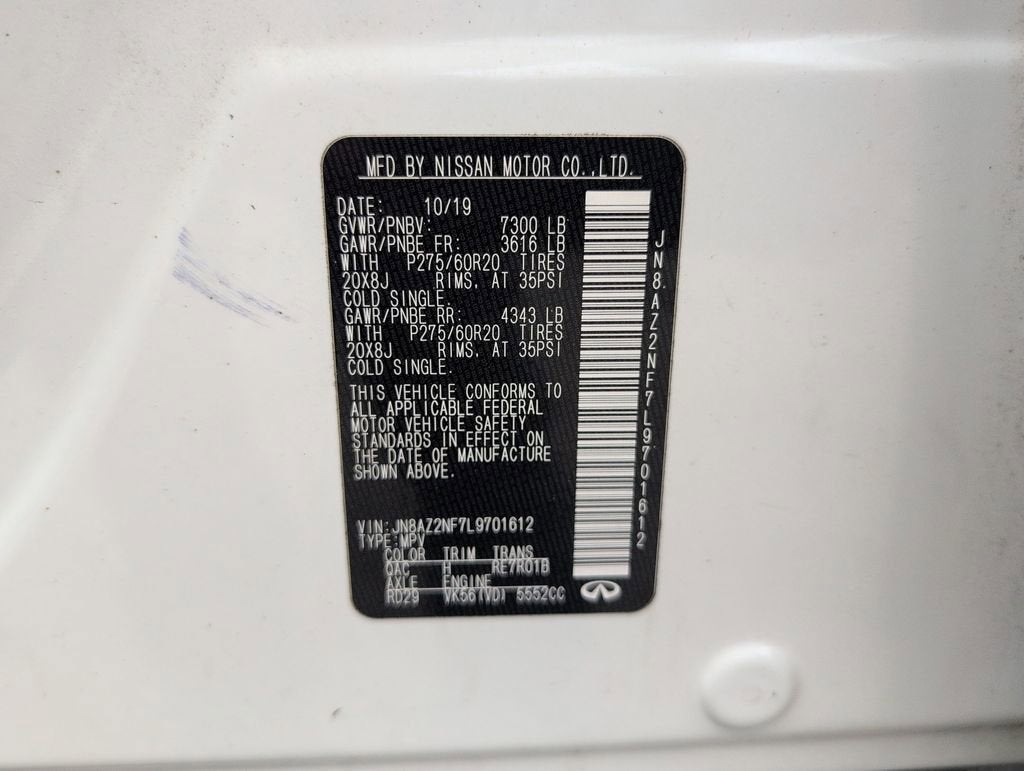This QX80 LUXE is nicely equipped with All-Season Package (All-Season Floor Mats and Cargo Protector), Cargo Package (First-Aid Kit, High-Density Non-Slip Rear Cargo Carpet, and Nylon-Cord Cargo Net), 13 Speakers, 2.937 Axle Ratio, 3rd row seats: split-bench, 4-Wheel Disc Brakes, ABS brakes, Air Conditioning, Alloy wheels, AM/FM radio: SiriusXM, Anti-whiplash front head restraints, Apple CarPlay/Android Auto, Auto High-beam Headlights, Auto tilt-away steering wheel, Auto-dimming door mirrors, Auto-dimming Rear-View mirror, Auto-leveling suspension, Automatic temperature control, Blind Spot Warning, Brake assist, Bumpers: body-color, CD player, Compass, Delay-off headlights, Driver door bin, Driver vanity mirror, Dual front impact airbags, Dual front side impact airbags, DVD-Audio, Electronic Stability Control, Emergency communication system: INFINITI Connection, Four wheel independent suspension, Front anti-roll bar, Front Bucket Seats, Front Center Armrest, Front dual zone A/C, Front fog lights, Front reading lights, Fully automatic headlights, Garage door transmitter: HomeLink, Heated door mirrors, Heated Front Bucket Seats, Heated front seats, Heated steering wheel, Illuminated entry, Leather Shift Knob, Leather steering wheel, Leather-Appointed Seats, Literature Kit, Low tire pressure warning, Memory seat, Navigation system: INFINITI InTouch Navigation, Occupant sensing airbag, Outside temperature display, Overhead airbag, Overhead console, Panic alarm, Passenger door bin, Passenger vanity mirror, Power door mirrors, Power driver seat, Power Liftgate, Power moonroof, Power passenger seat, Power steering, Power windows, Radio data system, Radio: AM/FM/HD w/Single In-Dash CD Player & MP3, Rain sensing wipers, Rear air conditioning, Rear anti-roll bar, Rear audio controls, Rear reading lights, Rear seat center armrest, Rear window defroster, Rear window wiper, Reclining 3rd row seat, Remote keyless entry, Roof Rail Cross Bars, Security system, Speed control, Speed-sensing steering, Split folding rear seat, Spoiler, Steering wheel memory, Steering wheel mounted audio controls, Tachometer, Telescoping steering wheel, Tilt steering wheel, Traction control, Trip computer, Turn signal indicator mirrors, Variably intermittent wipers, Voltmeter, and Wheels: 20 x 8.0 Aluminum-Alloy. Price does not include licensing costs, registration fees, taxes and dealer doc fee of $899.50 which are to be paid by the consumer.