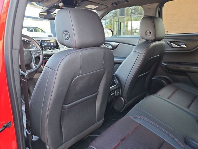 Recent Arrival! CARFAX One-Owner. Clean CARFAX. Red Hot This Blazer RS is nicely equipped with Enhanced Convenience Package (Heated Rear Outboard Seating Positions, Memory Settings For Driver Seat & Exterior Mirrors, Power Tilt & Telescoping Steering Column, and Ventilated Driver & Front Passenger Seats), Preferred Equipment Group 1RS (Heated Driver & Front Passenger Seats and Heated Steering Wheel), Trailering Equipment (170 Amp Alternator, Heavy-Duty Cooling System, Hitch Guidance, and Hitch View), 3.49 Final Drive Axle Ratio, 4-Wheel Disc Brakes, 6 Speakers, 6-Speaker Audio System Feature, 6-Way Power Front Passenger Seat Adjuster, ABS brakes, Air Conditioning, Alloy wheels, AM/FM radio: SiriusXM with 360L, Apple CarPlay/Android Auto, Auto High-beam Headlights, Auto-dimming door mirrors, Auto-dimming Rear-View mirror, Automatic temperature control, Brake assist, Bumpers: body-color, Child-Seat-Sensing Airbag, Compass, Delay-off headlights, Driver door bin, Driver vanity mirror, Dual front impact airbags, Dual front side impact airbags, Electronic Stability Control, Emergency communication system: OnStar and Chevrolet connected services capable, Exterior Parking Camera Rear, Four wheel independent suspension, Front anti-roll bar, Front Bucket Seats, Front Center Armrest, Front dual zone A/C, Front reading lights, Fully automatic headlights, Garage door transmitter, Heated door mirrors, Heated front seats, Heated steering wheel, High-Intensity Discharge Headlights, Illuminated entry, Knee airbag, Leather Shift Knob, Low tire pressure warning, Navigation System, Not Equipped w/Driver & Fr Passenger Heated Seats, Not Equipped w/Heated Rear Outboard Seats, Not Equipped w/Heated Steering Wheel, Not Equipped w/Rear Park Assist, Occupant sensing airbag, Outside temperature display, Overhead airbag, Overhead console, Panic alarm, Passenger door bin, Passenger vanity mirror, Perforated Leather-Appointed Seat Trim, Power door mirrors, Power driver seat, Power Liftgate, Power Panoramic Tilt-Sliding Sunroof, Power passenger seat, Power steering, Power windows, Radio data system, Radio: Chevrolet Infotainment 3 Plus System, Rear anti-roll bar, Rear reading lights, Rear seat center armrest, Rear window defroster, Rear window wiper, Remote keyless entry, Ride & Handling Suspension, Security system, SiriusXM w/360L, Speed control, Speed-sensing steering, Split folding rear seat, Spoiler, Steering wheel mounted audio controls, Tachometer, Telescoping steering wheel, Tilt steering wheel, Traction control, Trip computer, Turn signal indicator mirrors, Variably intermittent wipers, Voltmeter, Wheels: 20 Dark Android Machined-Face Aluminum, and Wheels: 21 Gloss Black Aluminum. Price does not include licensing costs, registration fees, taxes and dealer doc fee of $899.50 which are to be paid by the consumer. Mileage is EPA Estimated.