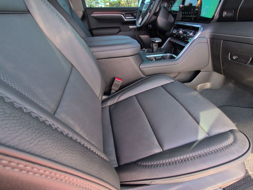 This Sierra 1500 Denali is nicely equipped with Denali Reserve Package (GMC MultiPro Power Steps, Power Sunroof, Wheel Locks (Set of 4) (LPO), and Wheels: 22 x 9 Painted Aluminum), Preferred Equipment Group 5SA (120-Volt Bed Mounted Power Outlet, 120-Volt Interior Power Outlet, 170 Amp Alternator, 2 Charge/Data USB Ports Inside Center Console, 2 Type-C Charge-Only Rear USB Ports, 2 USB Ports, Auto-Locking Rear Differential, Auxiliary External Transmission Oil Cooler, Bed View Camera, Chrome Header w/Signature Denali Chrome Grille, Chrome Recovery Hooks, Chrome Wheel To Wheel Assist Steps, Color-Keyed Carpeting Floor Covering, Deep-Tinted Glass, Electric Rear-Window Defogger, Floor-Mounted Center Console, Front Rain-Sensing Wipers, GMC Connected Access Capable, HD Surround Vision, Heated 2nd Row Outboard Seats, Heated Driver & Front Outboard Passenger Seating, Heavy-Duty Air Filter, Hill Descent Control, Hitch View, In-Vehicle Trailering System App, Integrated Trailer Brake Controller, Keyless Open & Start, LED Cargo Area Lighting, OnStar & GMC Connected Services Capable, Perimeter Lighting, Power Door Locks, Power Front Passenger Windows w/Express Up/Down, Power Front Windows w/Driver Express Up/Down, Power Rake & Telescoping Steering Column, Power Rear Windows w/Express Down, Power Sliding Rear Window w/Rear Defogger, Premium Bose 7-Speaker Sound System, Push Button Start, Rear Cross Traffic Braking, Rear Pedestrian Detection, Rear Wheelhouse Liners, Remote Vehicle Starter System, SiriusXM w/360L, Spray-On Pickup Bedliner w/Denali Logo, Steering Wheel Audio Controls, Theft Deterrent System (Unauthorized Entry), Trailer Camera Provisions, Trailer Side Blind Zone Alert, Ultrasonic Front & Rear Park Assist, Universal Home Remote, Ventilated Driver & Front Passenger Seats, Wi-Fi Hotspot Capable, and Wireless Charging), Technology Package (Multicolor 15 Diagonal Head-Up Display and Rear Camera Mirror), Trailering Package (Hitch Guidance), 10-Speed Automatic, 4WD, Jet Black Leather, 12-Way Power Driver Seat Adjuster w/Lumbar, 12-Way Power Passenger Seat Adjuster w/Lumbar, 3.23 Rear Axle Ratio, 4-Wheel Disc Brakes, 7 Speakers, ABS brakes, Adaptive suspension, Air Conditioning, Alloy wheels, AM/FM radio: SiriusXM with 360L, Apple CarPlay/Android Auto, Auto High-beam Headlights, Auto-dimming door mirrors, Auto-dimming Rear-View mirror, Automatic temperature control, Brake assist, Buckle to Drive, Bumpers: body-color, Compass, Delay-off headlights, Denali Premium Suspension w/Adaptive Ride Control, Driver door bin, Driver Memory, Driver vanity mirror, Dual Active Exhaust, Dual front impact airbags, Dual front side impact airbags, Electronic Stability Control, Emergency communication system: OnStar and GMC connected services capable, Enhanced Automatic Emergency Braking, Following Distance Indicator, Forge Perforated Leather Seat Trim, Forward Collision Alert, Front anti-roll bar, Front Bucket Seats, Front Center Armrest, Front dual zone A/C, Front fog lights, Front Pedestrian Braking, Front reading lights, Front wheel independent suspension, Fully automatic headlights, Garage door transmitter, Genuine wood console insert, Genuine wood dashboard insert, Genuine wood door panel insert, Heated door mirrors, Heated front seats, Heated rear seats, Heated steering wheel, Illuminated entry, IntelliBeam Automatic High Beam On/Off, Lane Keep Assist w/Lane Departure Warning, Low tire pressure warning, Memory seat, Navigation System, Occupant sensing airbag, Outside temperature display, Overhead airbag, Overhead console, Panic alarm, Passenger door bin, Passenger vanity mirror, Power door mirrors, Power driver seat, Power passenger seat, Power steering, Power windows, Premium audio system: GMC Infotainment